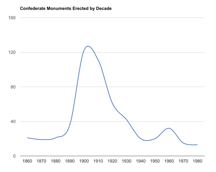 - I threw this together quickly with a slipshod methodology. I wrote a script that counted the number of lines in the Wikipedia List of monuments and memorials of the Confederate States of America which contained the strings “186”, “187”, “188”, etc. I dropped the 2000s because they were polluted by references to controversies over the monuments. I believe it’s good enough for use here because it matches the curve of the rigorous chart constructed by The Southern Poverty Law Center. ↩